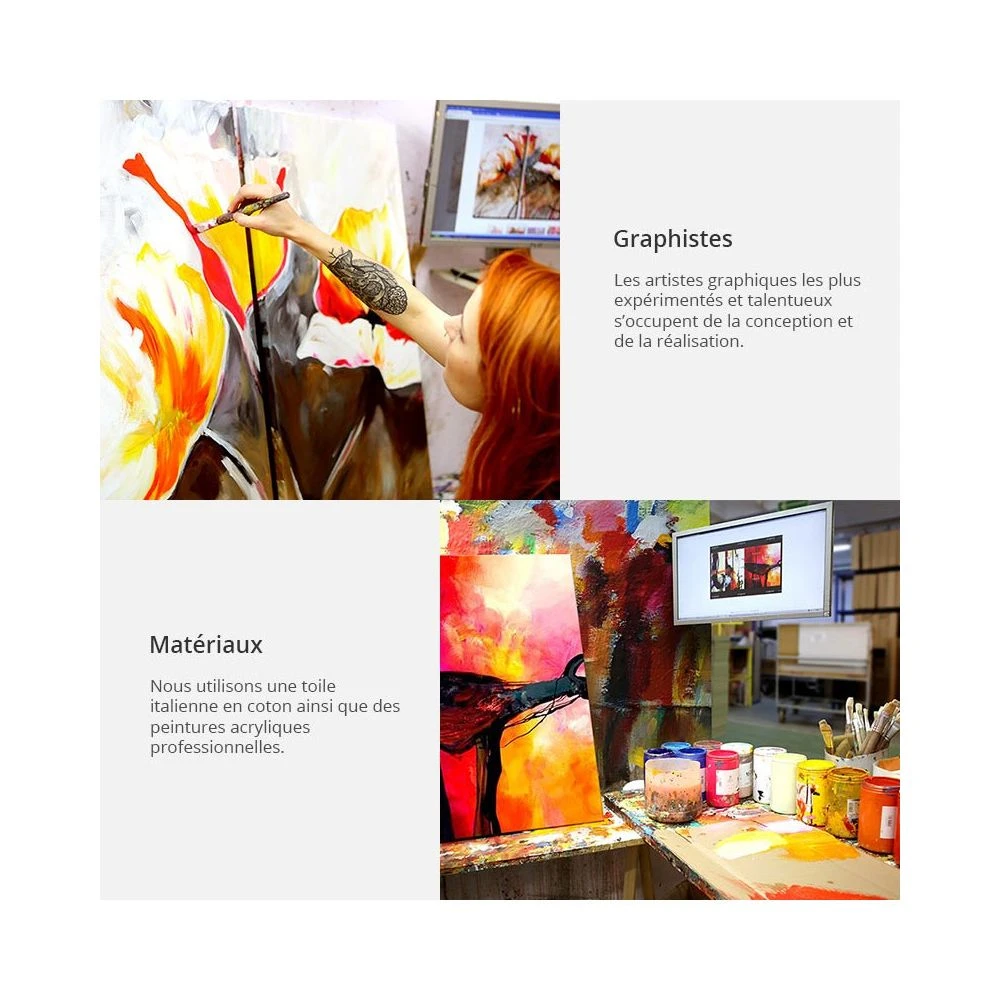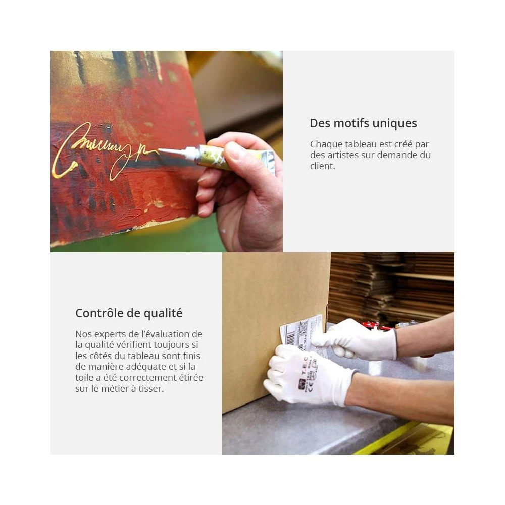 Les tableaux peints à la main, conçus sur une toile italienne professionnelle, sont, à l’avant, apprêts de manière adéquate et tendus avec soin sur le cadre en bois. Pour leur réalisation, seules des peintures acryliques professionnelles et de la plus haute qualité sont utilisés.