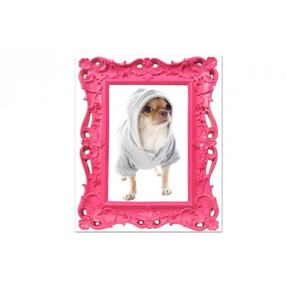 Ce Tableau baroque enfant Chihuahua rose 55×80 cm sera la touche fun de votre décoration. En effet, ce chihuahua en sweat dans un cadre rose baroque est un contraste original qui fera sensation.