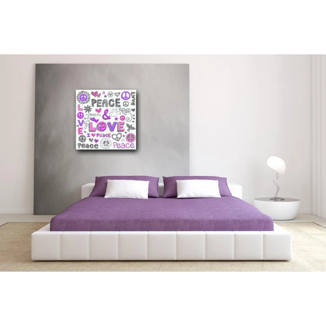Peace and love, tel est votre Leitmotiv, un leitmotiv que vous affichez clairement dans votre décoration grâce à ce Tableau pop ton violet HIPPIE 50×50 cm. Représentant l’ilustre sigle Peace and love, il est aussi graphique que design !