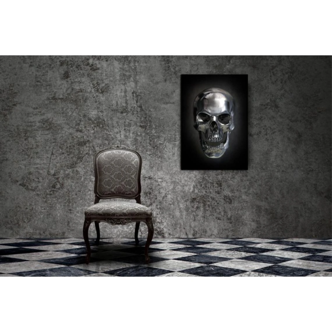 Ce Tableau rock Tête de mort design argentée sur fond noir 55×80 cm est un tableau surprenant qui apportera la touche originale et décalée nécessaire à votre déco.