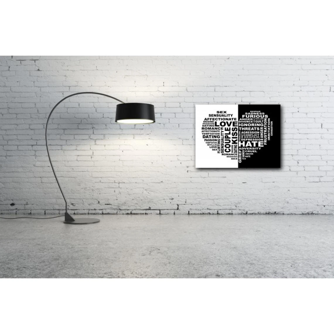 Ce tableau romantique dans les tons noir et blanc de 50×50 cm est un coeur coupé en deux. D’un coté ce que l’on aime, de l’autre ce que l’on déteste, il vous apprendre l’amour en bicolore. Un tableau design et glam pour vos intérieurs tendances.