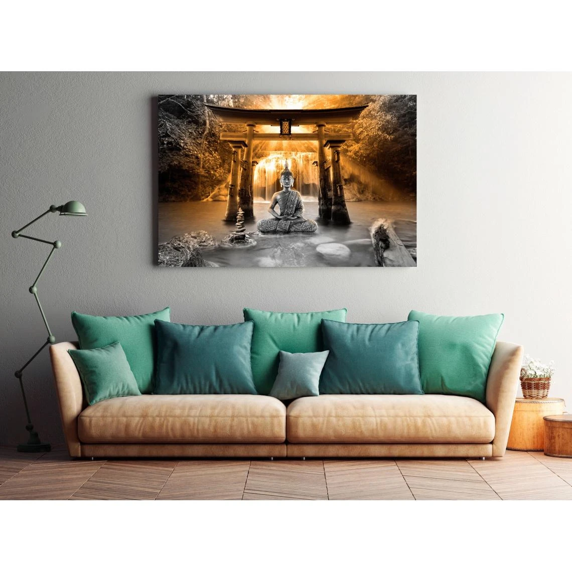 Points forts Decoshop26 Tableau sur toile décoration murale image imprimée cadre en bois à suspendre Sourire de Bouddha (1 partie) Large Orange 120×80 cm 11_0009303