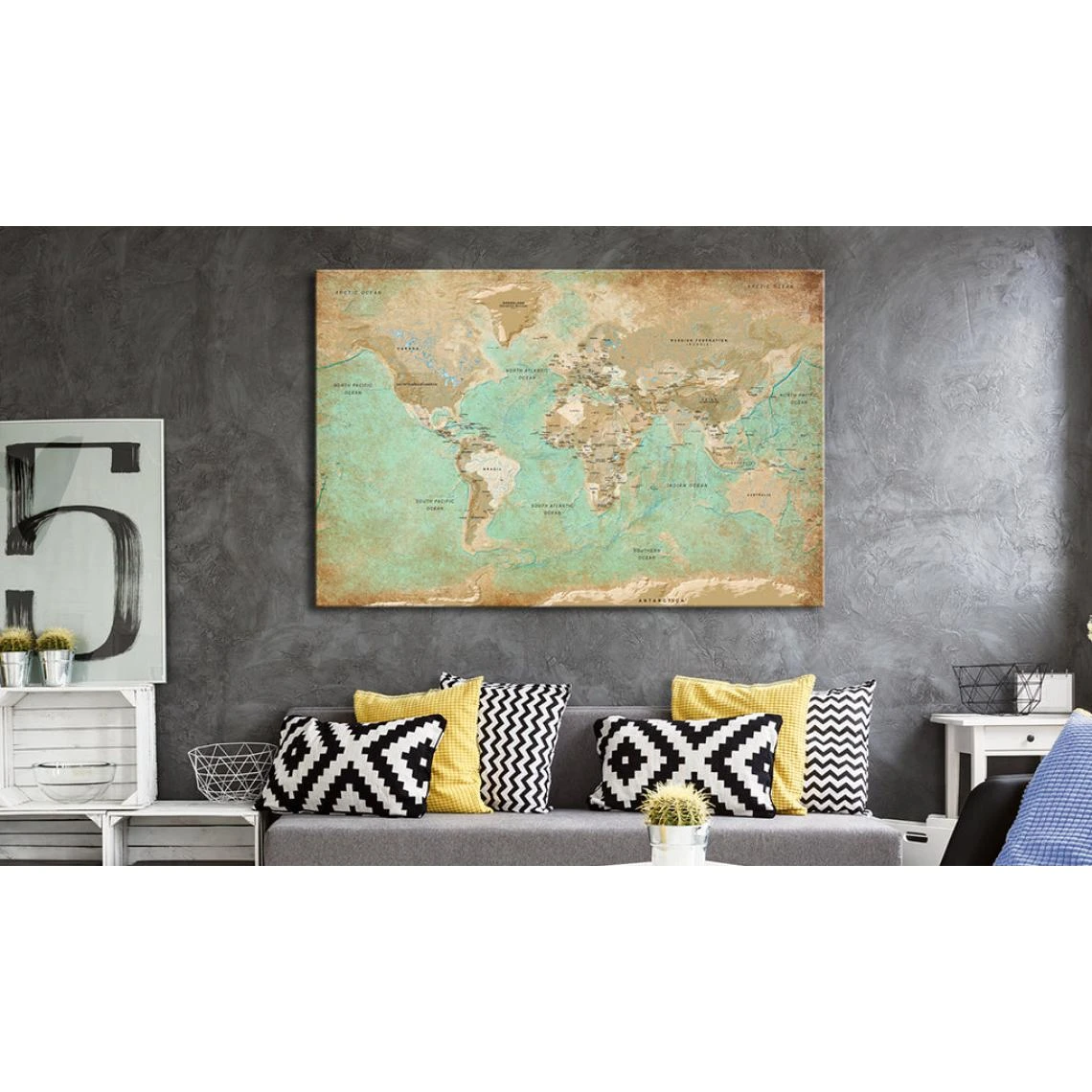 Points forts Decoshop26 Tableau sur toile décoration murale image imprimée cadre en bois à suspendre Carte du monde : Voyage Céladon 90×60 cm 11_0004530