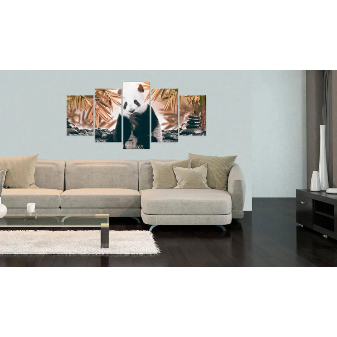 Points forts Decoshop26 Tableau sur toile en 5 panneaux décoration murale image imprimée cadre en bois à suspendre Panda pensif 100×50 cm 11_0002684