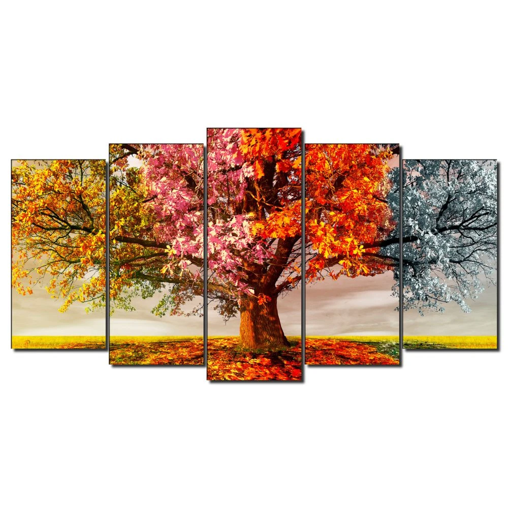 Points forts Dekoarte Dekoarte 404 – Tableau moderne sur toile monté sur cadre en bois 5 pièces XXL, nature arbre quatre saisons, 200x100cm