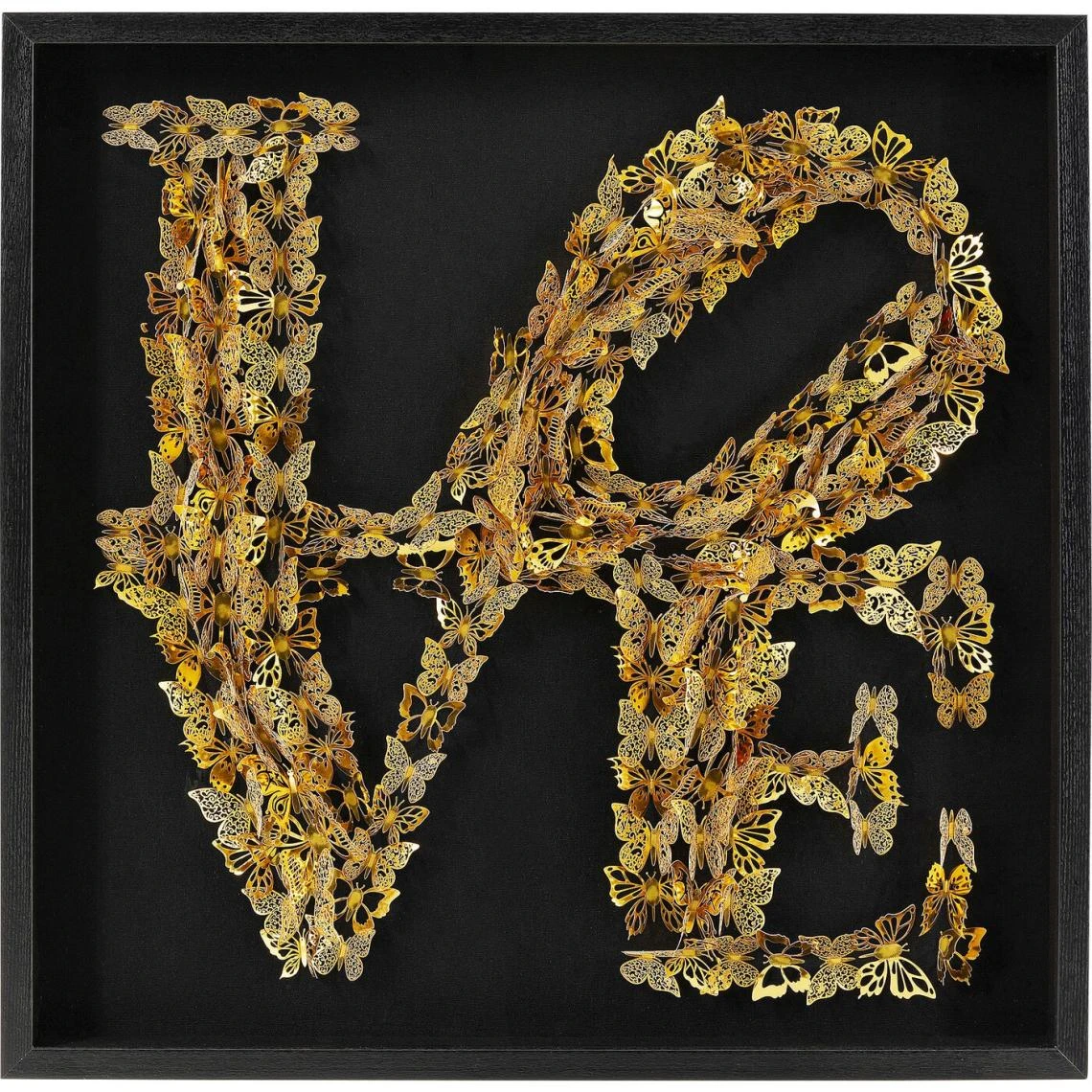 Avec les papillons en relief disposés pour former les lettres LOVE, ce tableau en 3D sous vitre apporte une ambiance douce et romantique à votre intérieur. La combinaison de noir et de doré complète avec élégance.