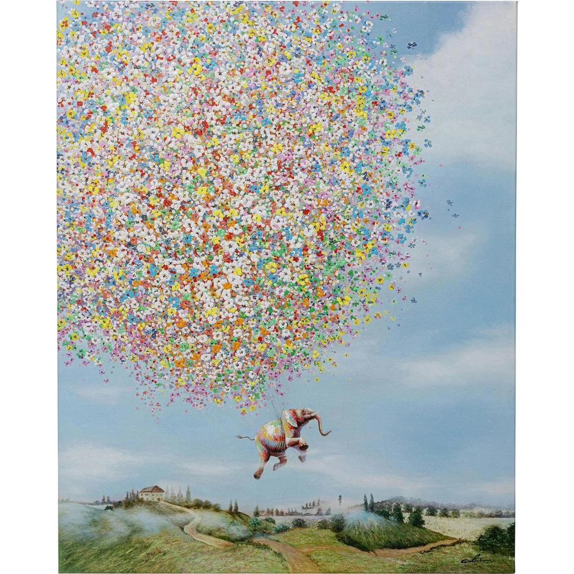 Cette toile représente un éléphant, porté par des milliers de fleurs, en train de voler. Il apportera une touche de magie dans votre intérieur en évoquant un sentiment de liberté.