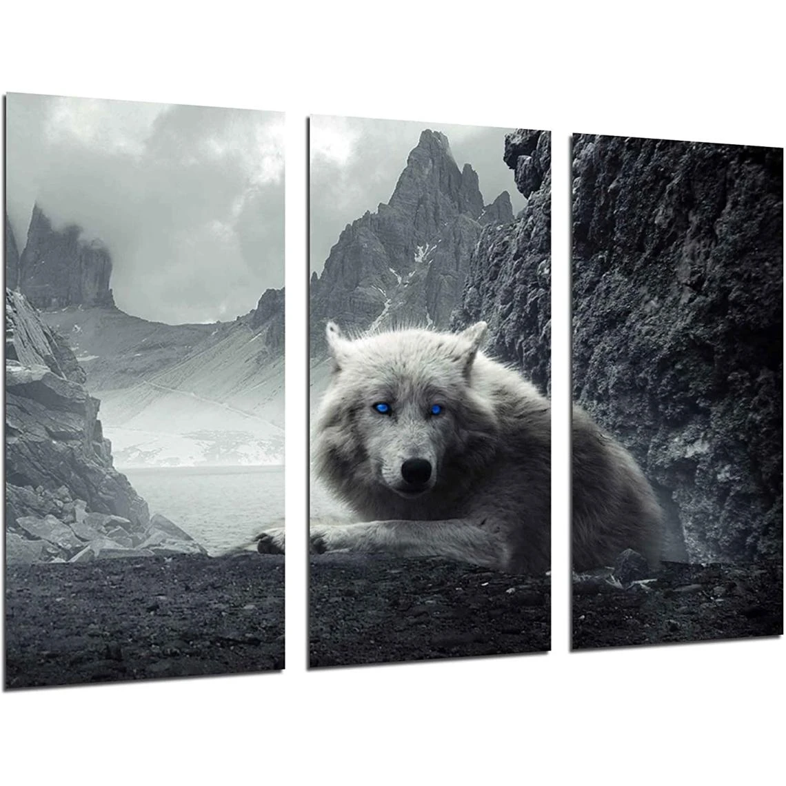 Cuadros Cámara – Composition photo en 3 parties, sur bois 6 mm, animaux sauvages, loup blanc, 97 x 62 cm (avec 5 cm de distance entre chaque cadre). Décoration pour votre maison.