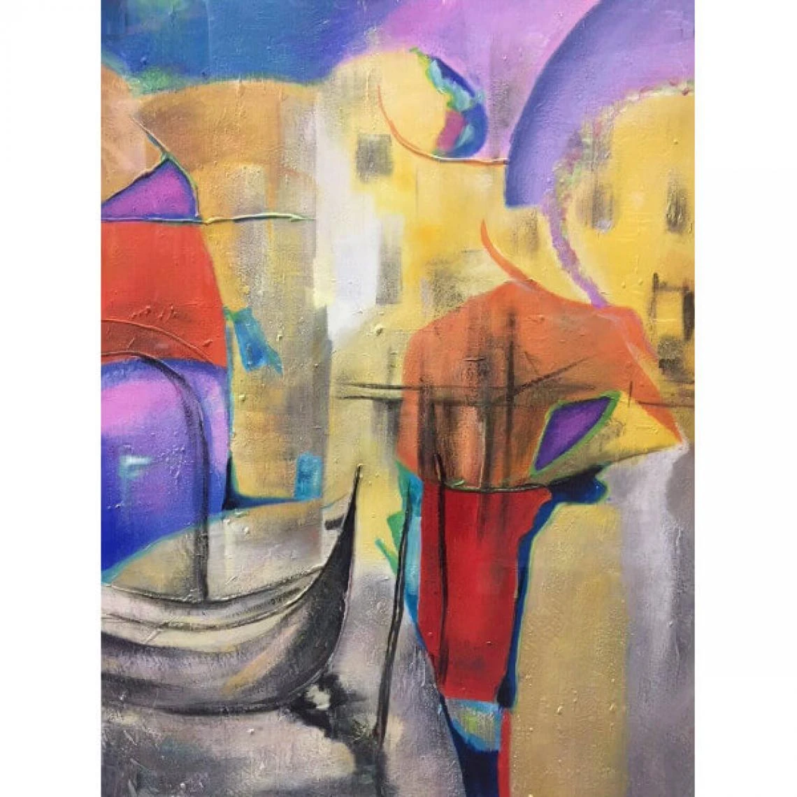 Tableau, peint à la main, on imagine une gondole dans les canaux de Venise.
