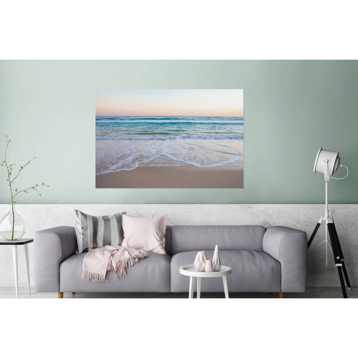 Cette image d’une plage et de la mer a des couleurs pastel grâce à un coucher de soleil.