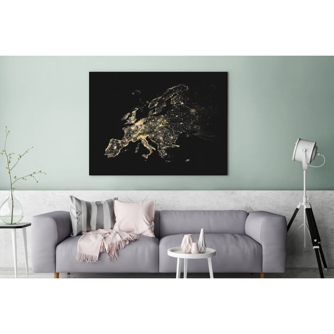 Cette carte noire montre l’Europe au moyen de lumières dorées. Dans des pays comme la Hollande et l’Italie, on trouve davantage de lumières.