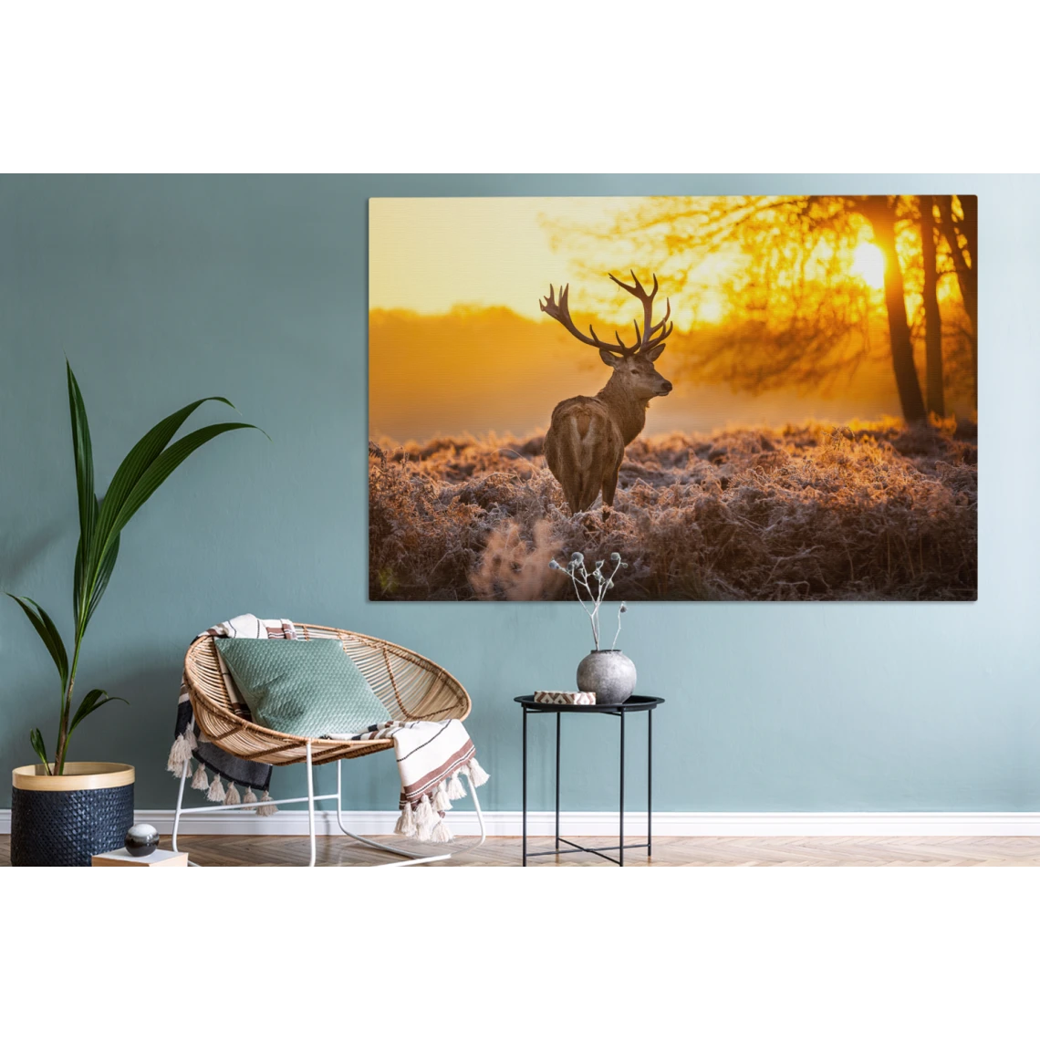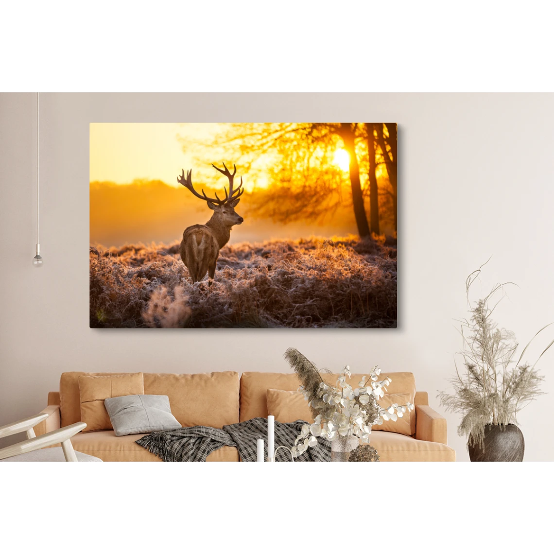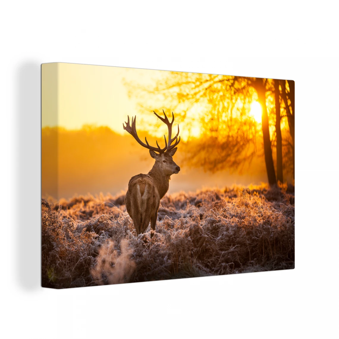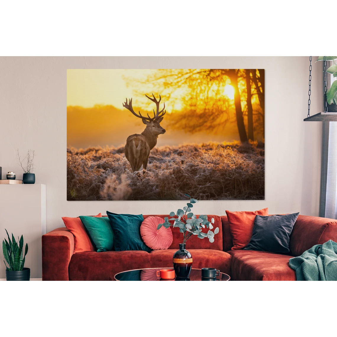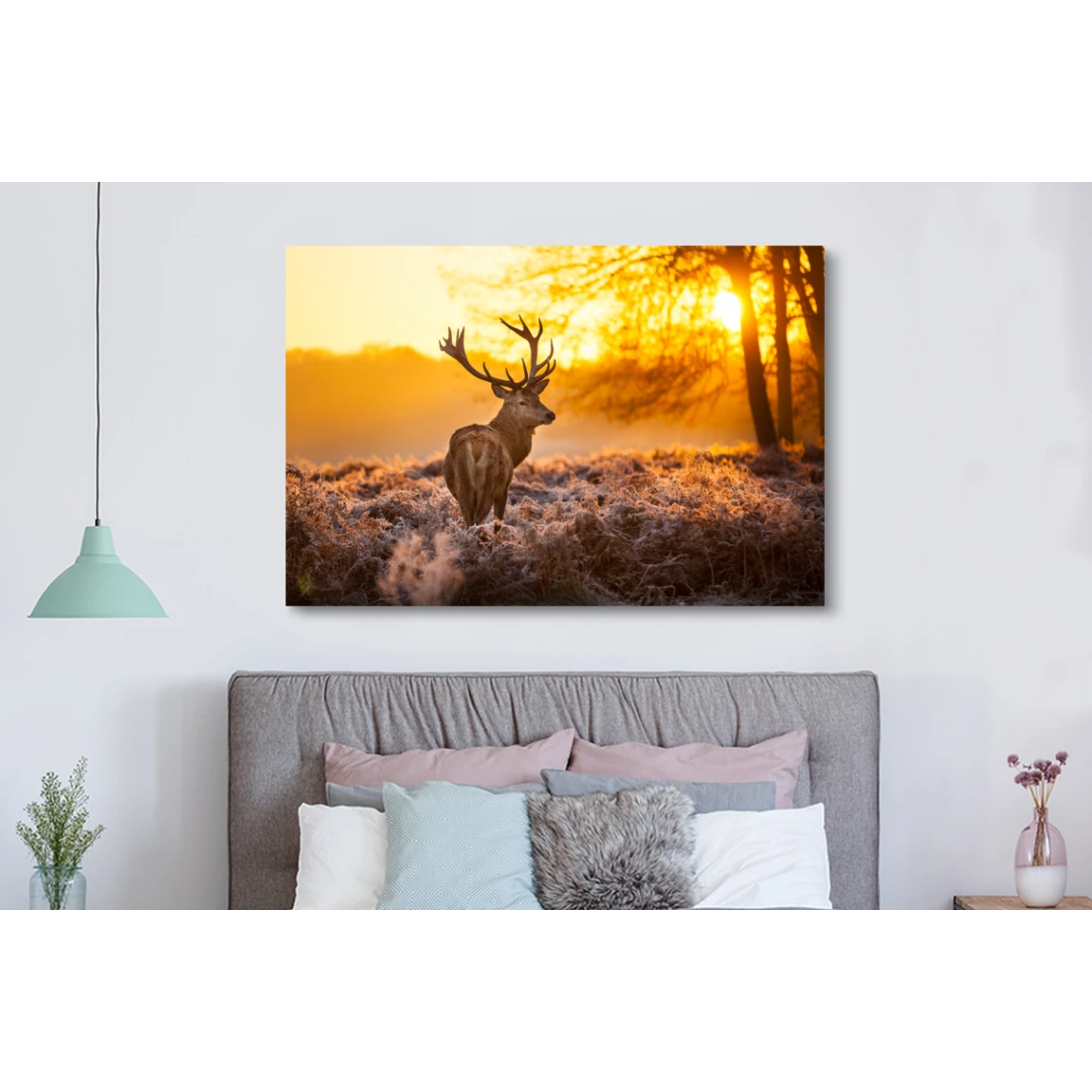 Points forts MuchoWow Tableau sur toile Cerf – Hiver – Coucher de soleil Decoration murale 150×100 cm