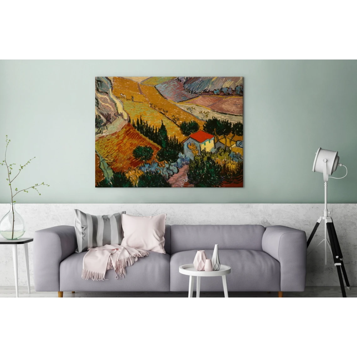 Égayez votre mur avec cette œuvre d’art du vieux maître Vincent van Gogh. L’image est de haute qualité et a un aspect agréable. Donnez à votre maison une décoration unique avec ce tableau : Paysage avec une maison et un laboureur.
