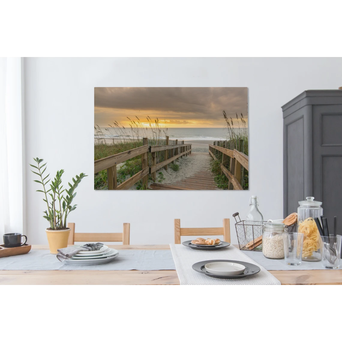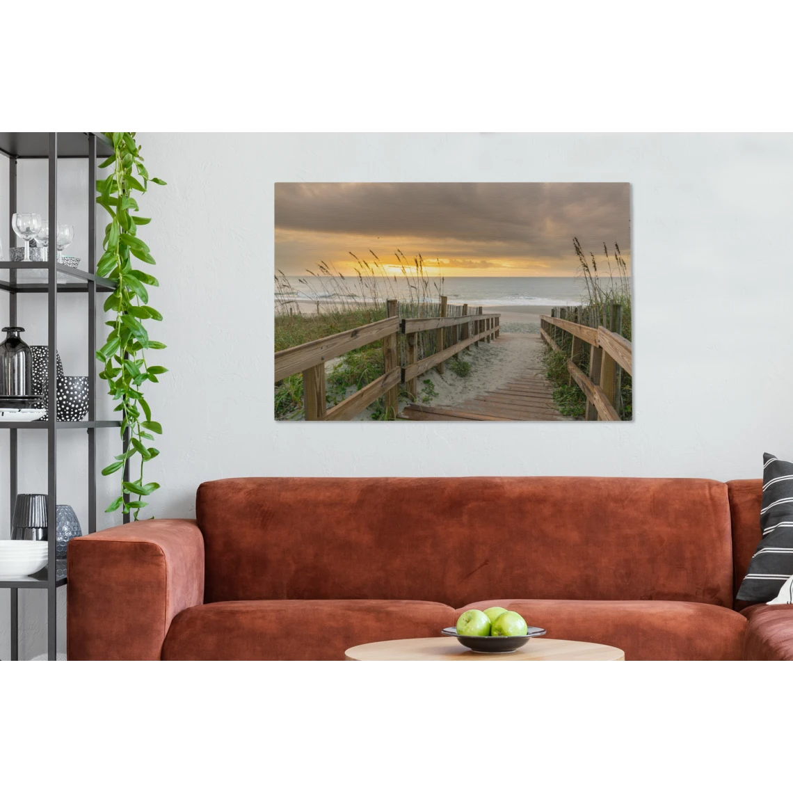 Un chemin couvert de bois mène à la plage et à la mer. On peut voir un coucher de soleil doré dans le ciel.