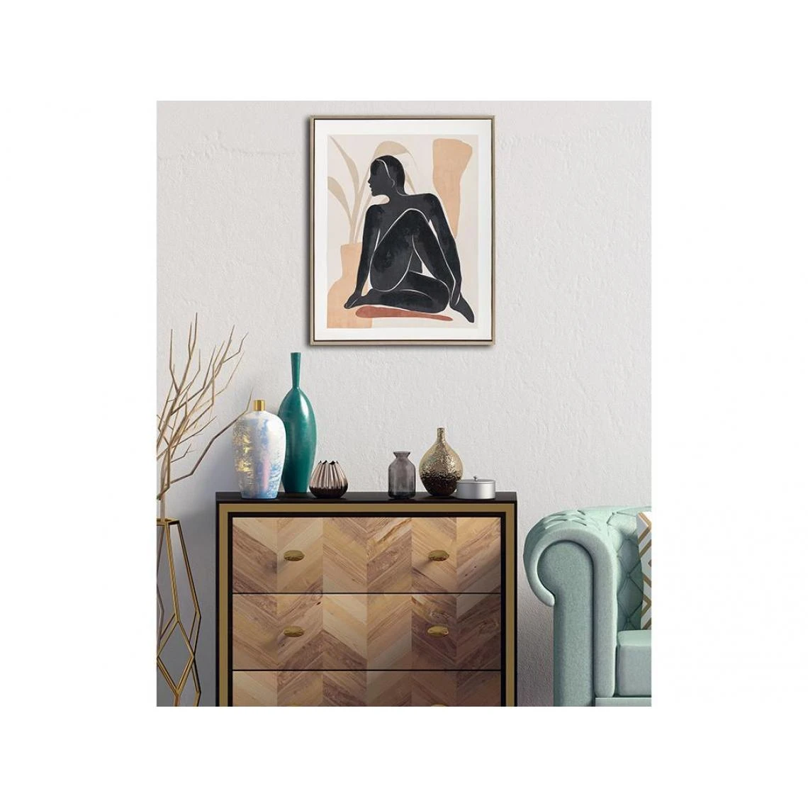 Points forts Vente-Unique Toile imprimée encadrée en bois et peinture acrylique – 42 x 52 cm – Beige et noir – BLUNEA